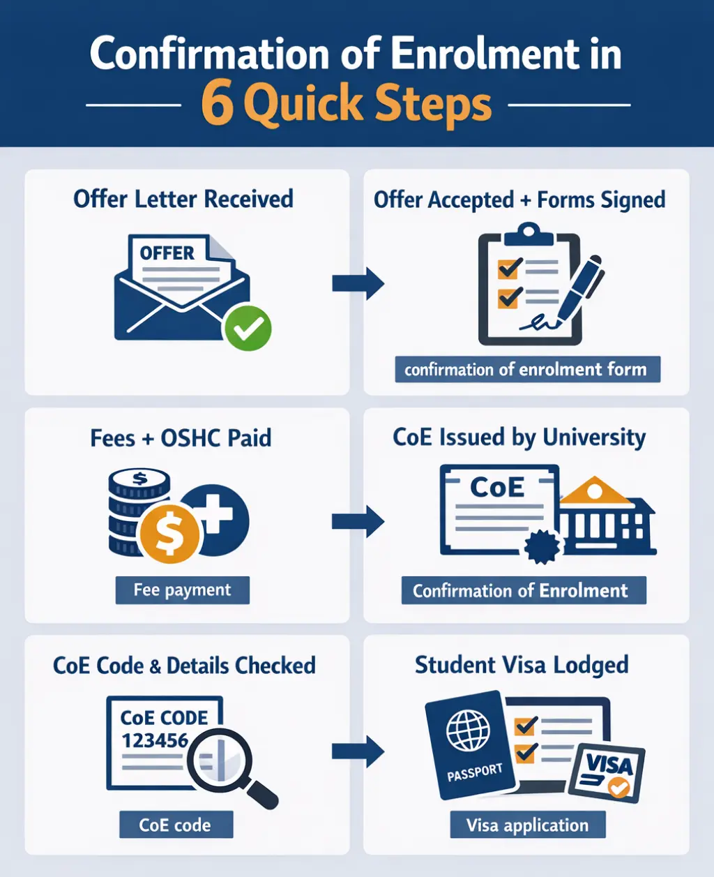 Getting a Confirmation of Enrolment in Australia is a structured process: choose a course, get an offer, accept it, pay what’s required, then wait for the provider to issue the eCoE via email or portal. Most unis issue it within a few days to a couple of weeks once everything is complete.