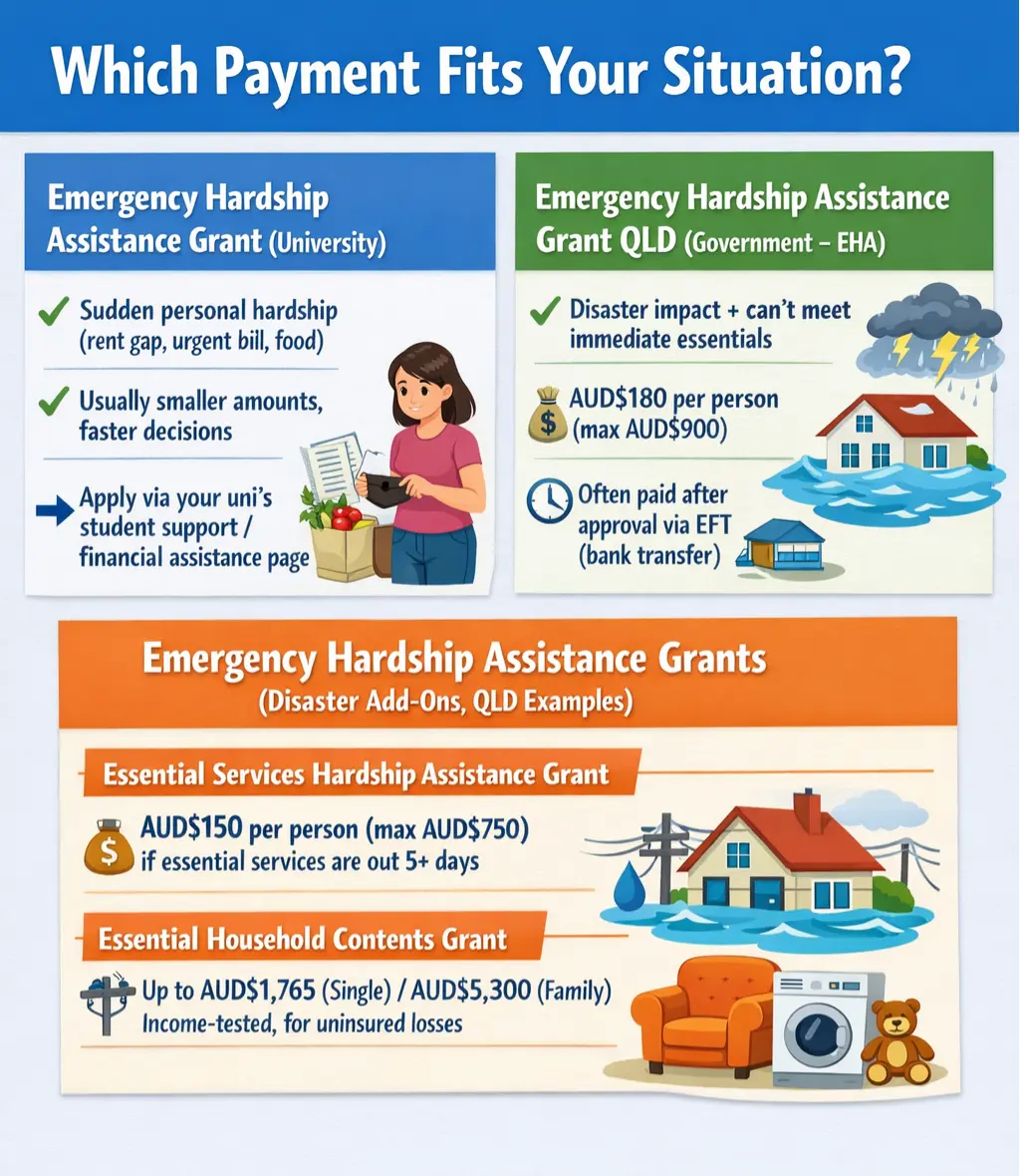 An emergency hardship assistance grant is short-term money meant to cover essentials (food, rent, bills, medical costs) so you can stay enrolled. There are student hardship grants offered by Australian universities (usually small, quick, and evidence-based). For disaster situations, state and Commonwealth payments can be activated, such as Queensland’s Emergency Hardship Assistance (up to AUD$900 for EHA, for individuals, AUD$180) and the Australian Disaster Recovery Payment (an Australian Government disaster recovery payment of AUD$1,000 for adults, AUD$400 for children). Depending on the application, time frames differ, so the best course of action for application is this: select grants, collect forms, go online, and follow through with students.