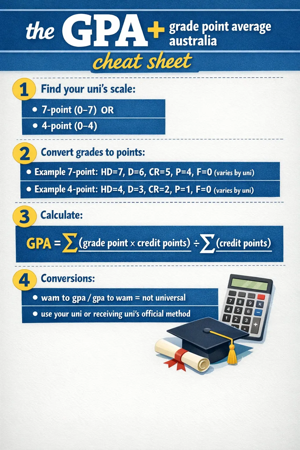 PickMyUni tip: if you’re transferring, applying for postgrad, or submitting an overseas application, you’ll often be asked for GPA even if your home uni talks in WAM. That’s when you want your uni’s official explanation (or the receiving uni’s conversion tool).