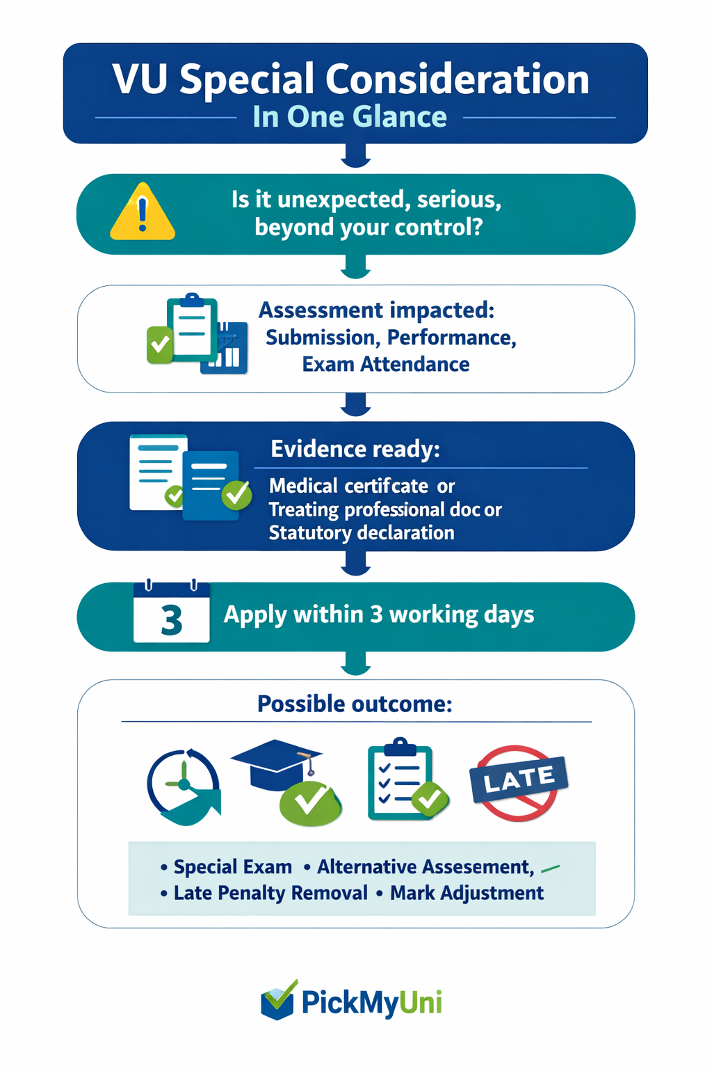 VU even gives a clear example: being unwell on exam day, seeing a doctor for documentation, and lodging the special consideration application right after the exam.